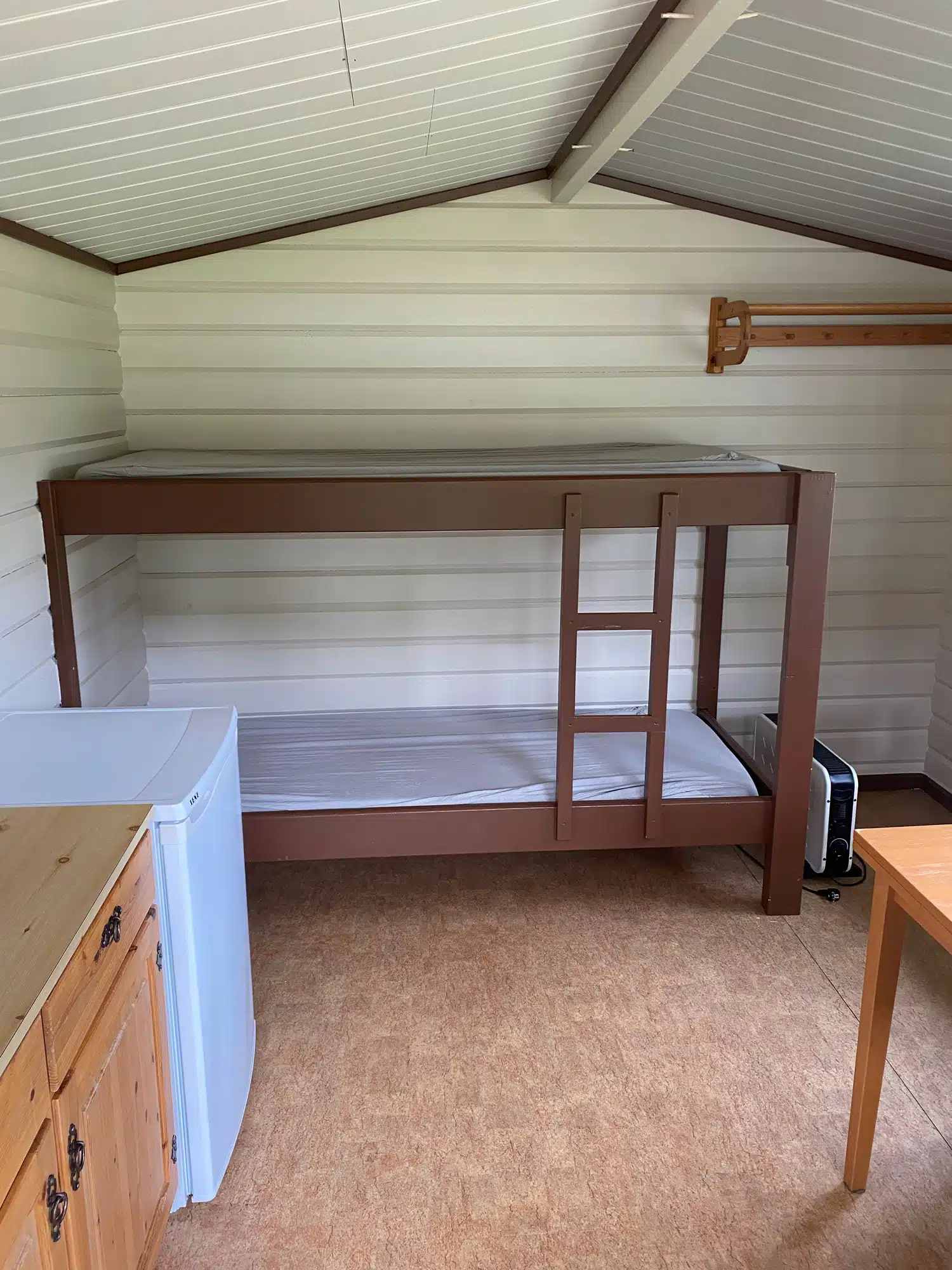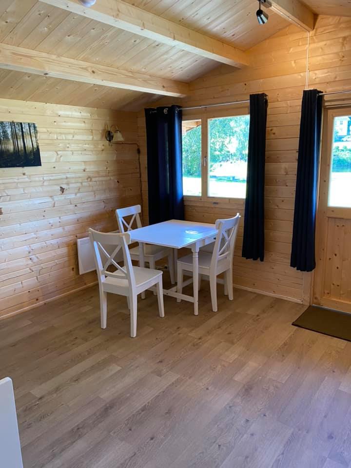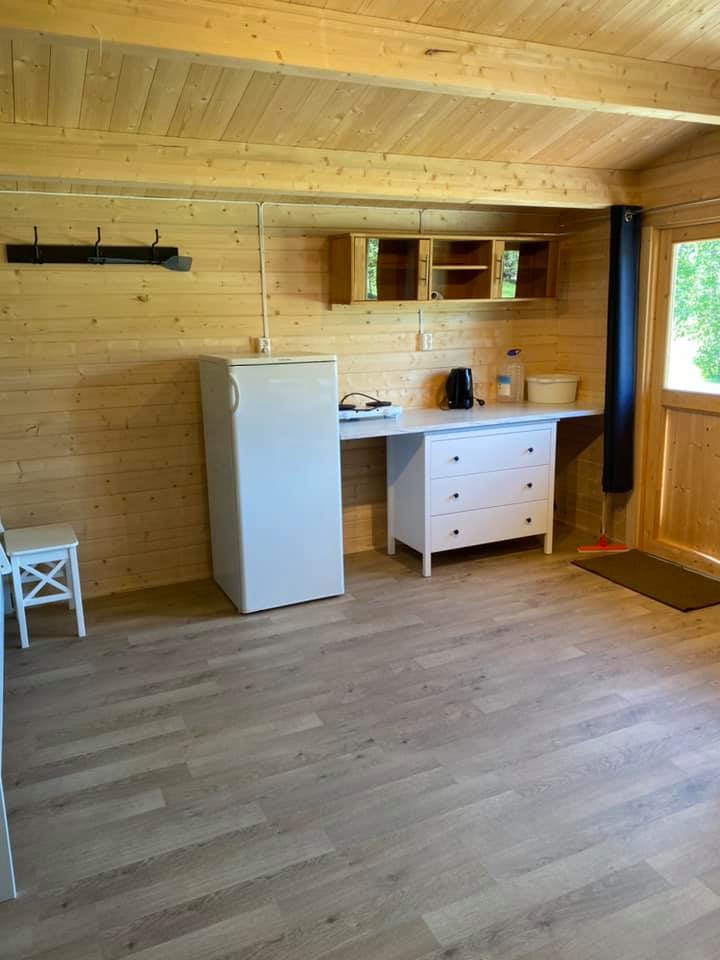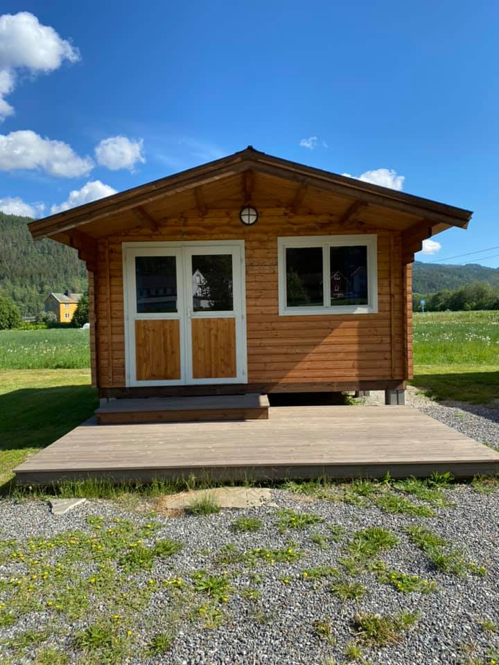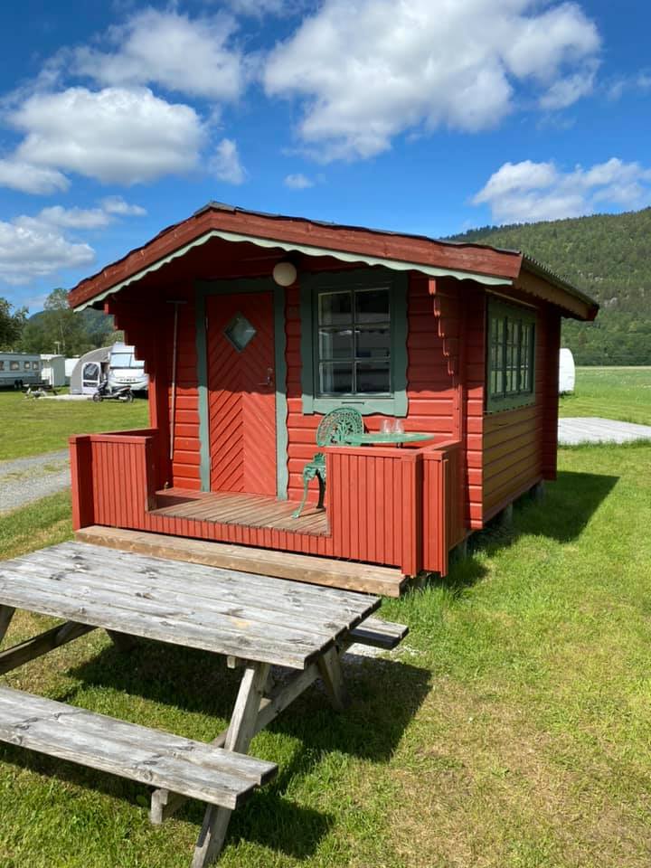 Telt, samt fem utleiehytter i forskjellig størrelser.