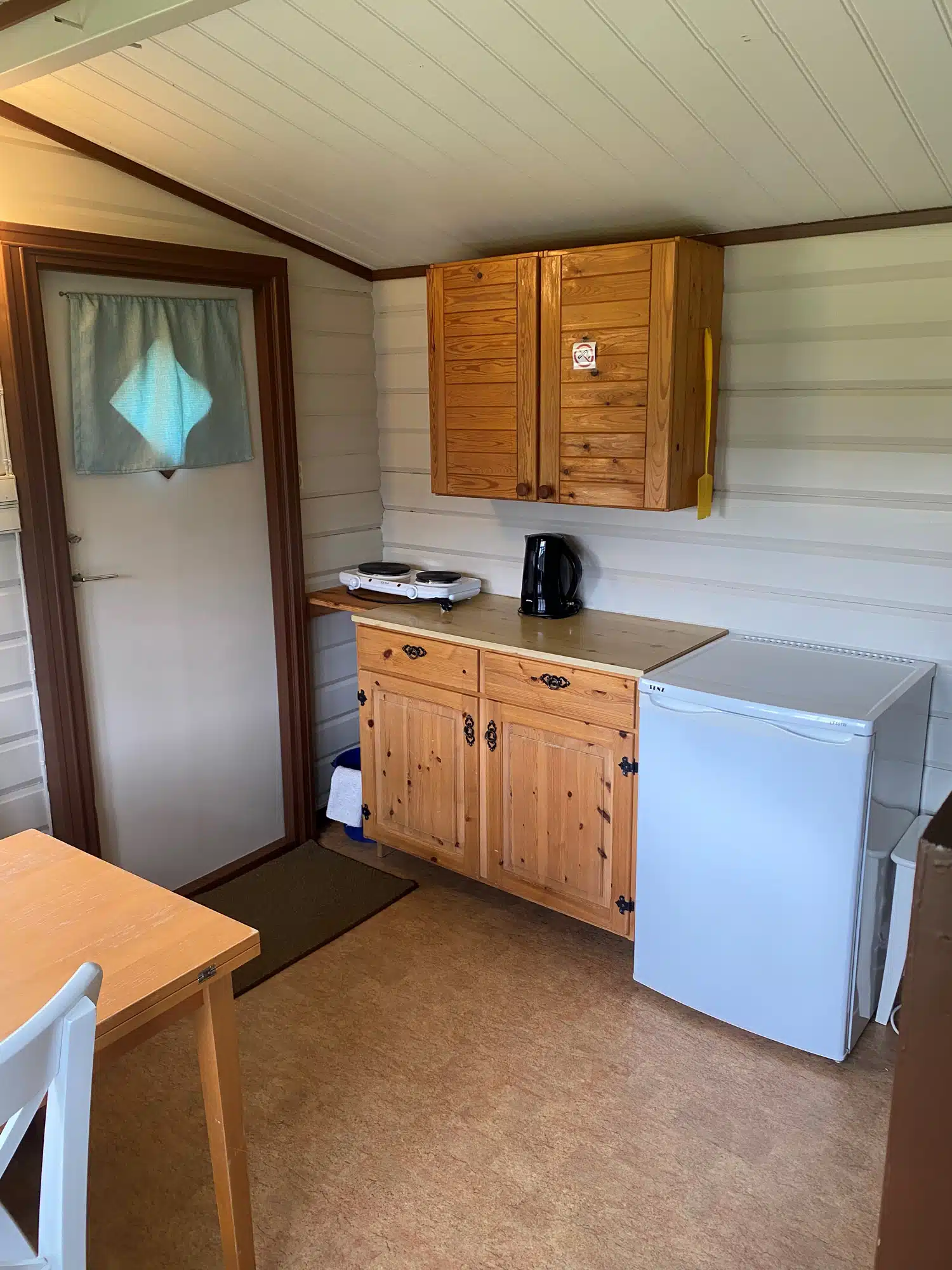 Enroms 2-mannshytte med køyeseng, spisegruppe, kjøleskap med liten fryser og kjøkkenkrok med dobbel kokeplate, kasseroller, stekepanne og nødvendige redskaper. Hytta har også vannkoker og varmeovn.